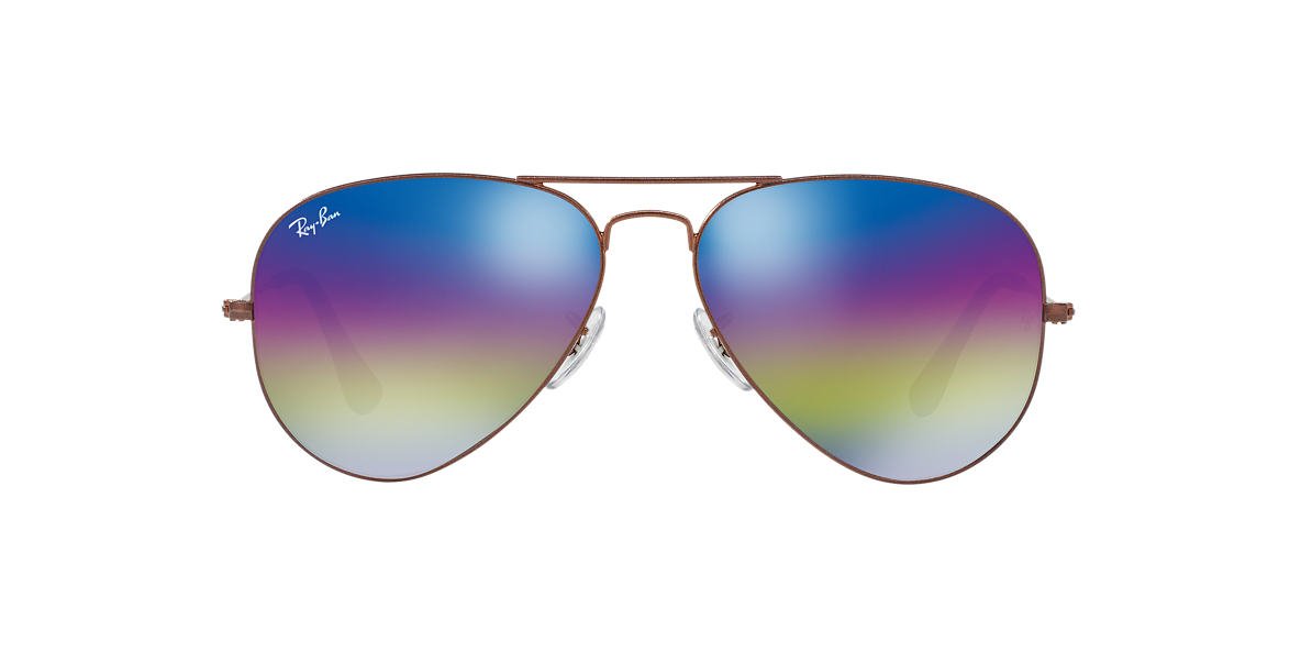 New to the Ray-Ban family of iconic styles is the Rainbow lens. Available in two sizes, the newest Aviator style features a bronze frame with gradient flash lenses that have four shades of color on the lens, giving the flashy rainbow effect. With Ray-Ban Rainbow shades, brightly bold style can be on display in a more subtle, accessorized way. Due to the unique nature of this lens, color variations may be present from the image to the actual product.